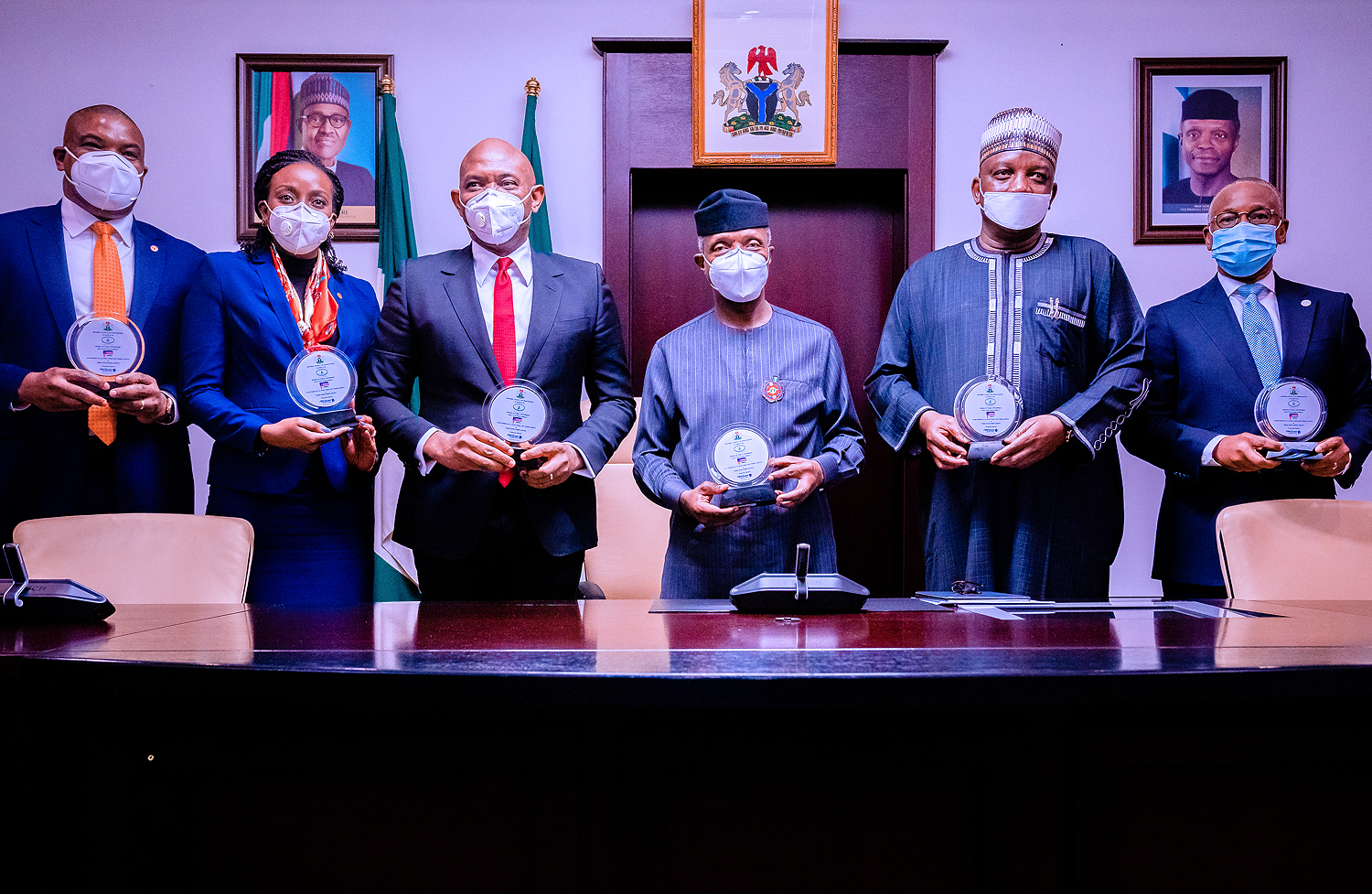 l-r: Managing Director/CEO, Transcorp Power Limited, Mr Christopher Ezeafulukwe; President/CEO, Transcorp Plc, Mrs Owen Omogiafo; Chairman, Transcorp Plc, Mr. Tony Elumelu; Vice President, Professor Yemi Osinbajo; Minister of Power, Mamman Saleh; and Director General Bureau of Public Enterprise(BPE) , Mr. Alex Okoh, at the signing ceremony of the sale of FGN’s 100% equity in Afam Power Plc/Afam Three Fast Power Limited to Transcorp Consortium in Abuja on Thursday